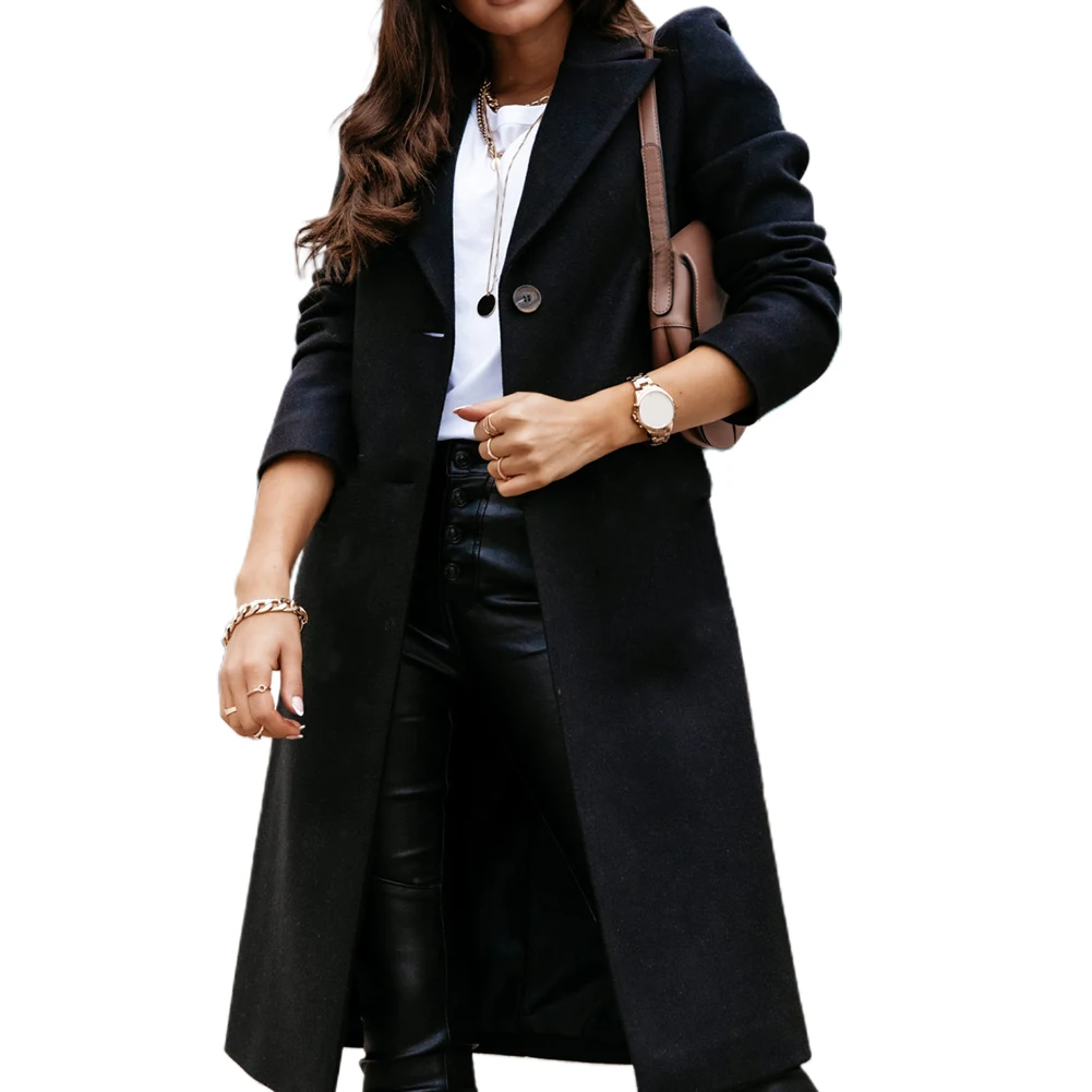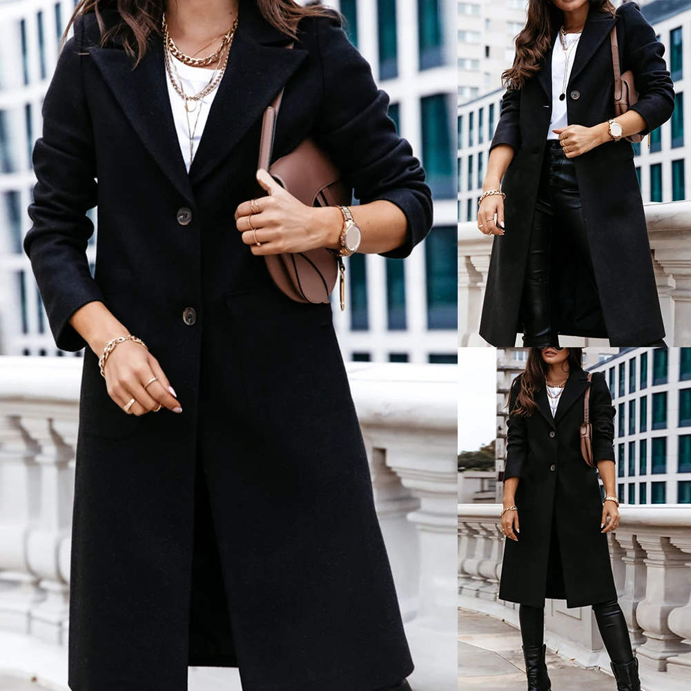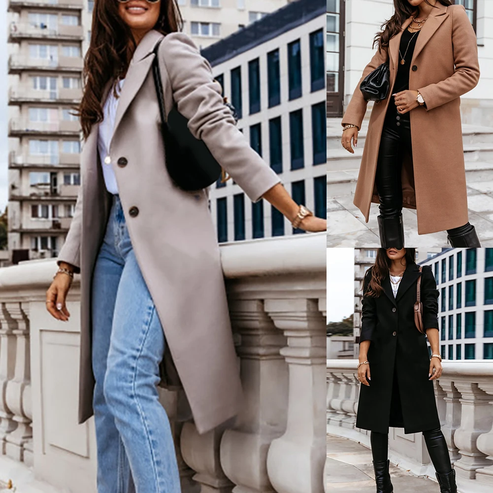 Plus Size Long Sleeve Winter Women Long Wool Coat : Long Sleeve Button Mid-length Jacket Outerwear